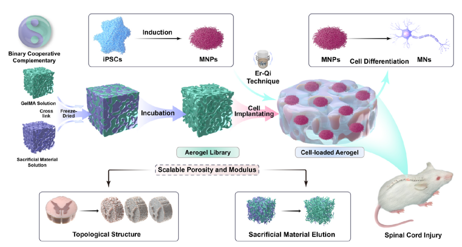 中國(guó)科學(xué)院廣州生物醫(yī)藥與健康研究院(以下簡(jiǎn)稱“廣州健康院”)納米轉(zhuǎn)化醫(yī)學(xué)研究組和華中科技大學(xué)協(xié)和醫(yī)院孫家明教授團(tuán)隊(duì)近期聯(lián)合在 Materials Today Bio發(fā)表了題為 “Aerogel library with varying porous structures and mechanics regulates motor neuron progenitor differentiation for spinal cord injury repair” 的研究論文。該研究構(gòu)建了一種微納結(jié)構(gòu)與力學(xué)性能可調(diào)控的多孔氣凝膠庫(kù),揭示了仿生三維微環(huán)境的孔隙結(jié)構(gòu)與力學(xué)強(qiáng)度對(duì)人源誘導(dǎo)多能干細(xì)胞(hiPSCs)來源的運(yùn)動(dòng)神經(jīng)前體細(xì)胞(MNPs)譜系命運(yùn)調(diào)控作用和關(guān)鍵分子機(jī)制,并驗(yàn)證了其在脊髓損傷修復(fù)中的功能再生潛力。