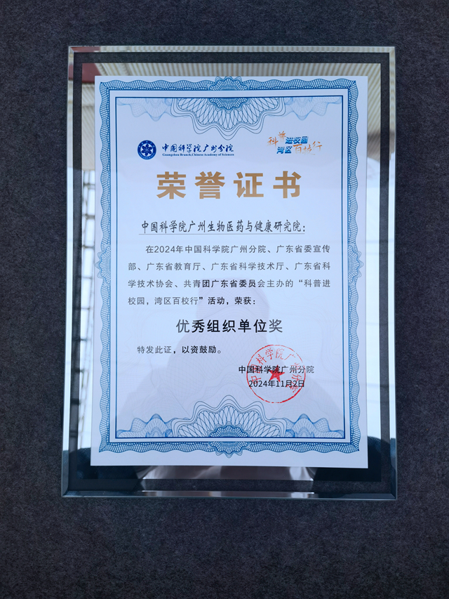 活動現(xiàn)場還頒發(fā)了“中國科學(xué)院科普進校園灣區(qū)百校行”優(yōu)秀組織獎,廣州健康院榮獲此獎項。