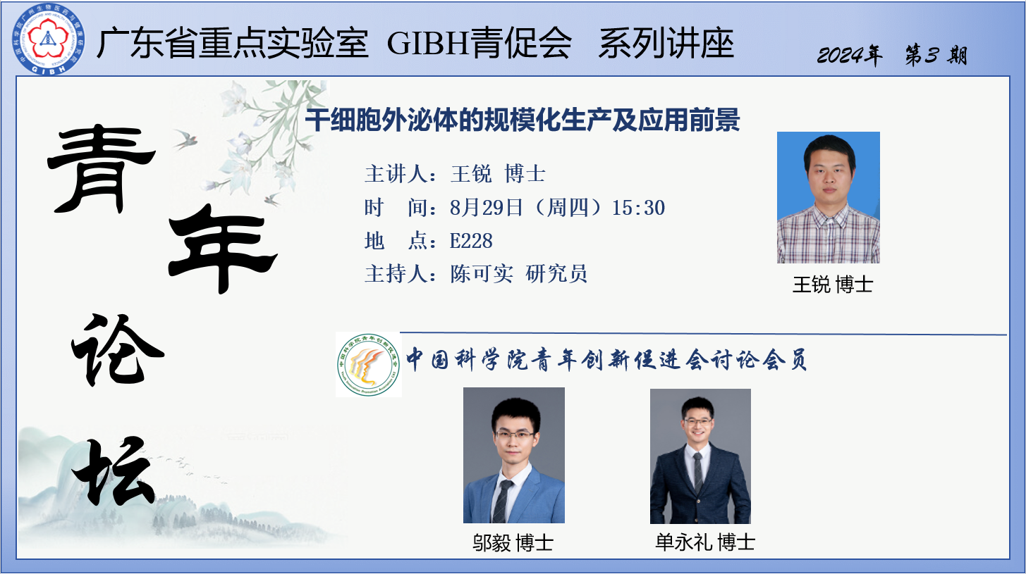 2024年8月29日廣東省重點實驗室GIBH青促會系列講座(2024年第3期):干細胞外泌體的規(guī)模化生產及應用前景